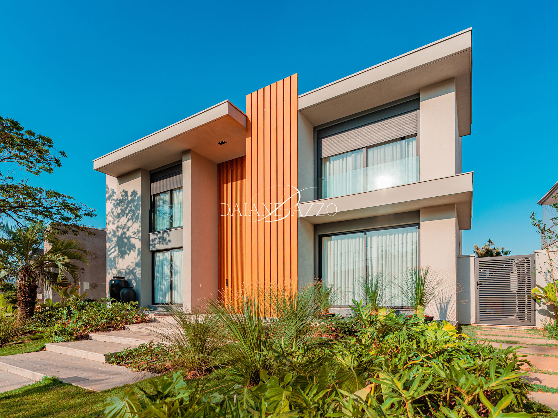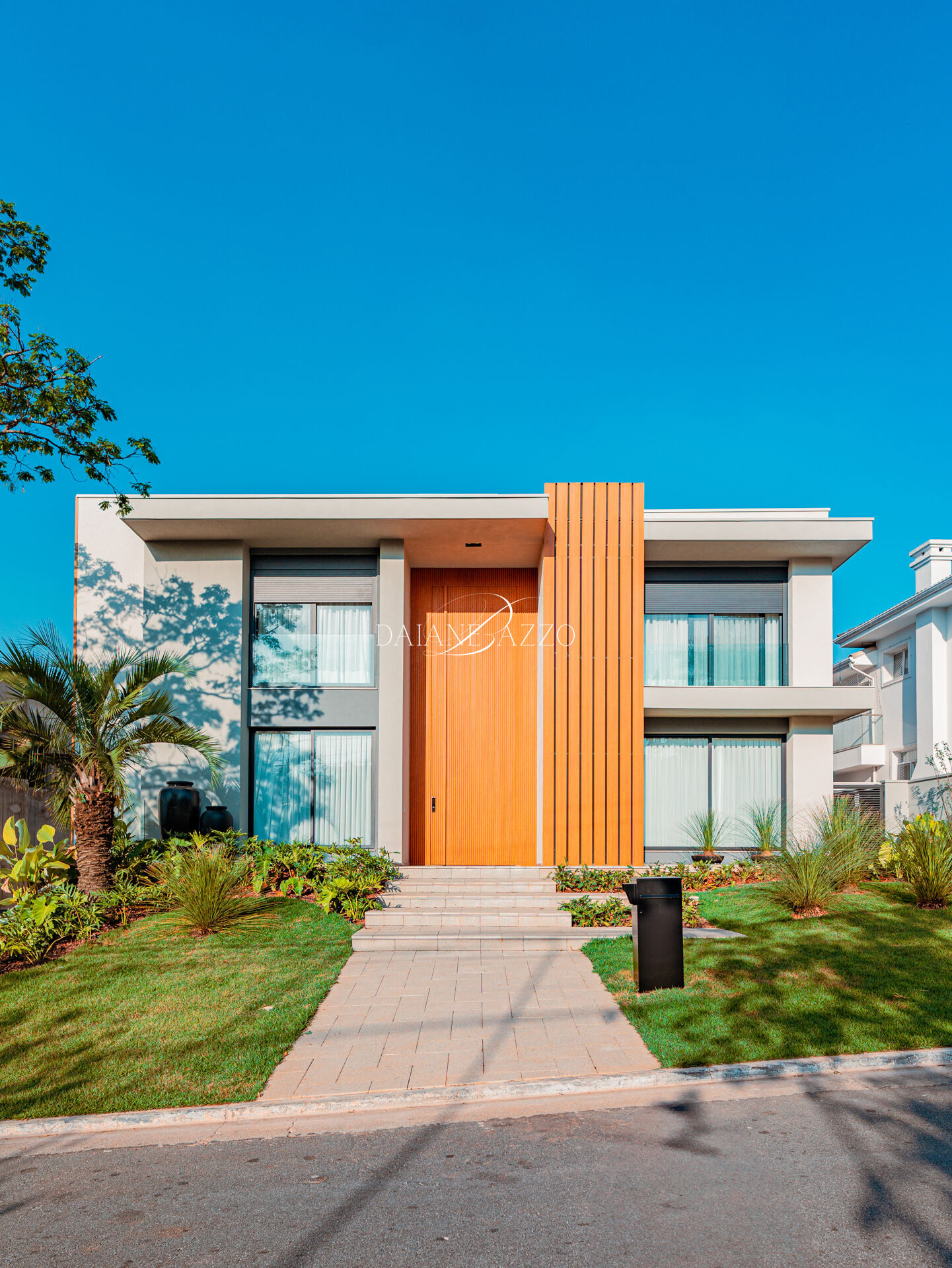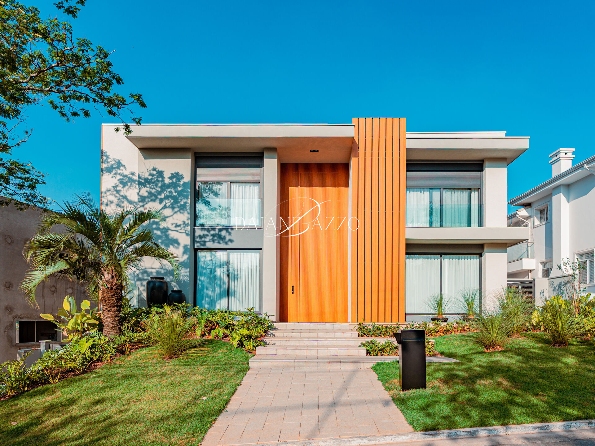 Implantada em um terreno de 650,07 m², com 962,38 m² de área construída, a casa impressiona desde a chegada, com fachada imponente de 21 metros, porta social com 6 metros de altura e elegantes brises em alumínio, que reforçam o caráter arquitetônico do projeto.