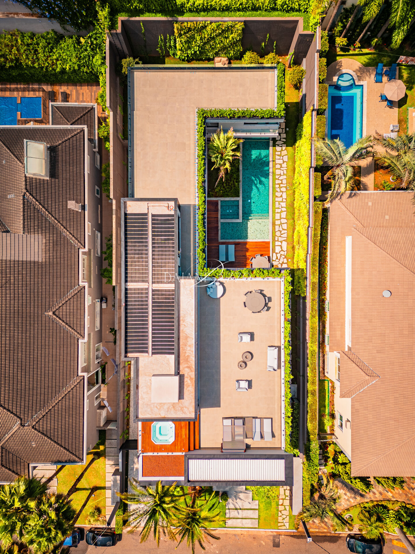 A casa conta ainda com automação total, aspiração central, energia solar e fotovoltaica, infraestrutura para gerador, cisterna de 10.000 litros e eletrodomésticos Gorenje, Betazzoni e Electromec.