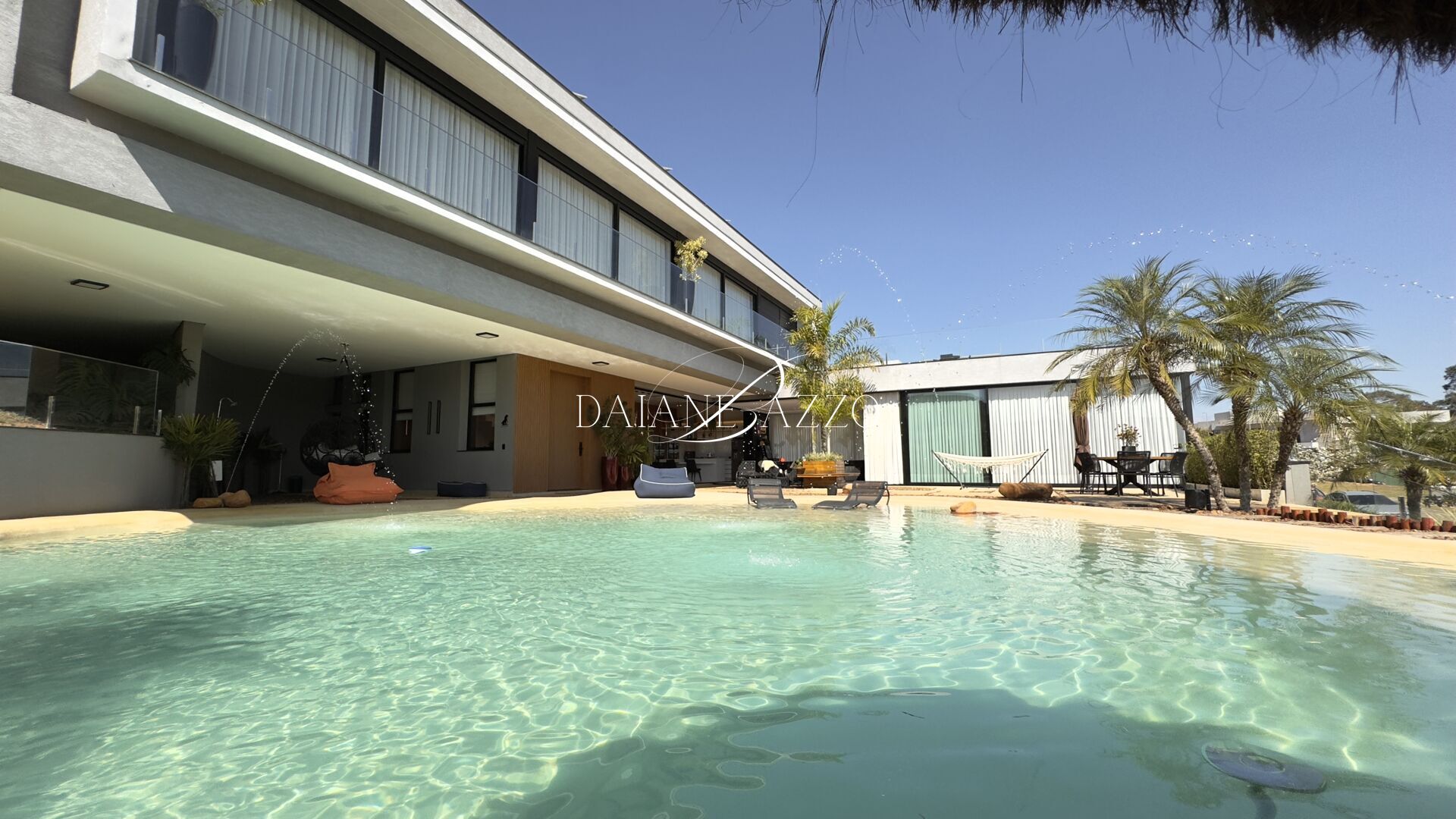 Implantada em três terrenos integrados, a casa impressiona pela amplitude e pelos detalhes de alto padrão. O destaque absoluto é a piscina natural de quase 100m², tratada com ozônio, aquecida, com bar molhado, chafarizes e até toboágua, garantindo diversão para todas as idades.